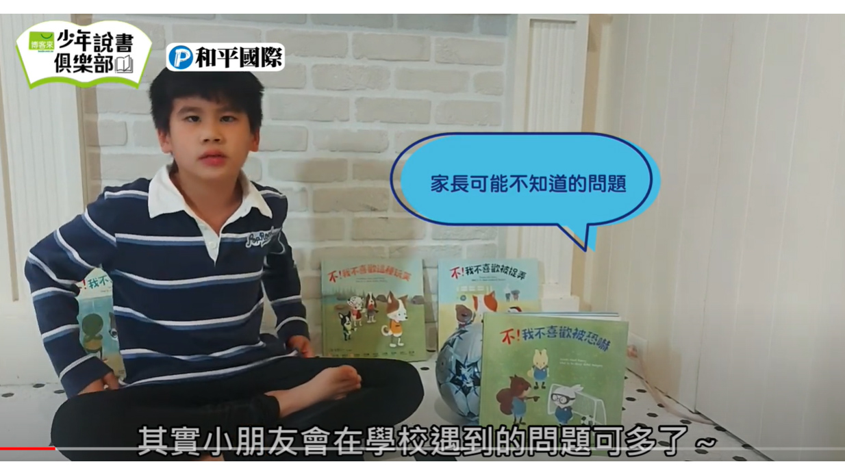 弟弟在影片中提到的《不!我不喜歡被恐嚇》,是參加運動社團可能會遇到的問題:「球隊的隊員因為在意成績而怒罵沒表現好的其他隊員。」